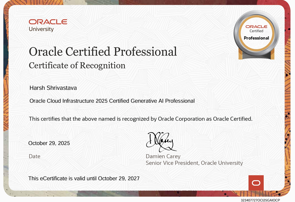 Earned the Oracle Certified Professional credential in Oracle Cloud Infrastructure 2025 – Generative AI, demonstrating expertise in deploying, managing, and optimizing AI-driven cloud solutions. This certification validates my proficiency in generative AI frameworks, cloud architecture, and secure infrastructure design, reflecting a strong commitment to innovation and technical excellence in Oracle Cloud technologies.