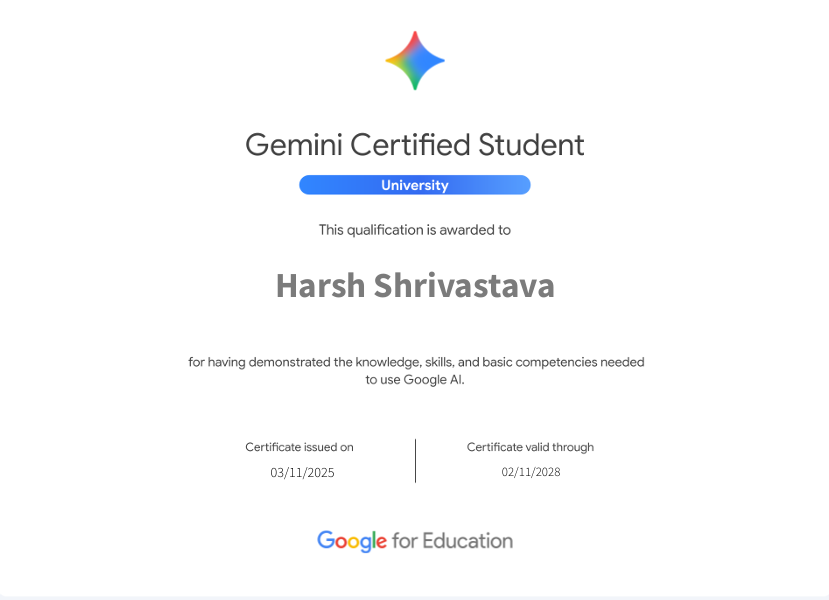 Earned the Google Gemini Certified Student credential, demonstrating knowledge, skills, and foundational competencies in utilizing Google AI technologies. This certification validates my ability to effectively apply AI tools and concepts for problem-solving, productivity enhancement, and innovation using Google’s Gemini platform.