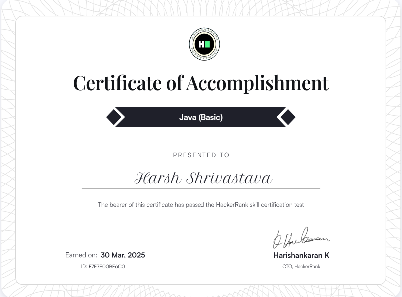 Earned the Java certification from HackerRank, demonstrating proficiency in Java programming concepts, problem-solving skills, and the ability to write efficient code. This certification validates my expertise in Java and my readiness to tackle real-world programming challenges.