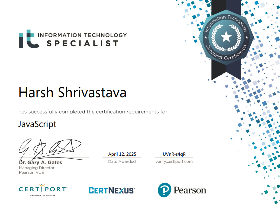 Earned the Certiport IT Specialist certification in JavaScript, demonstrating proficiency in DOM manipulation, control structures, functions, and ES6+ syntax. This credential reflects my ability to build dynamic, interactive web applications using core JavaScript skills.