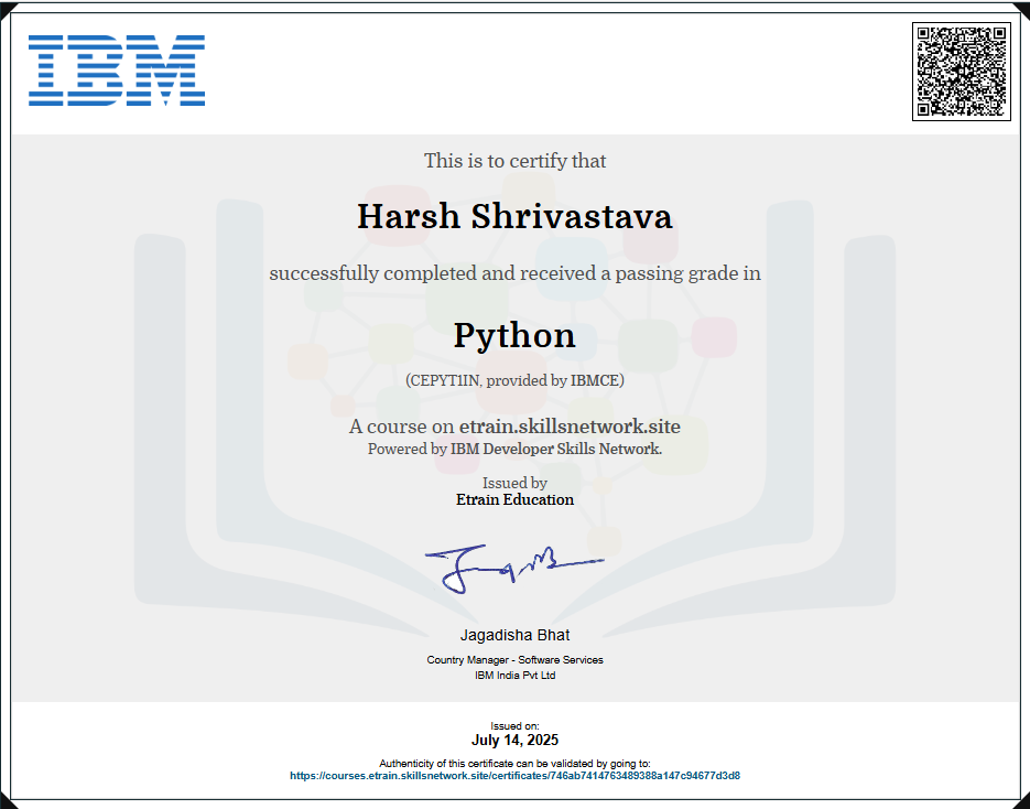 Successfully completed the IBM Python certification, covering core programming concepts, scripting, and backend logic. This certification reflects my strong foundation in Python and its practical use in projects like API development and automation.